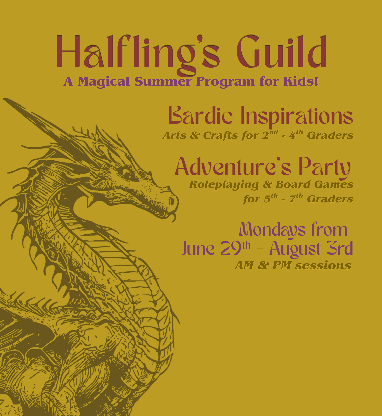 The Halfling’s Guild is made up of six weeks of adventure that revolves around great weekly themes surrounding fantasy and science fiction. We have awesome educators that will teach two programs; an Arts and Crafts morning program for 2nd-4th graders and an afternoon program for 5th-7th graders that focuses on TTRPGs and board games.